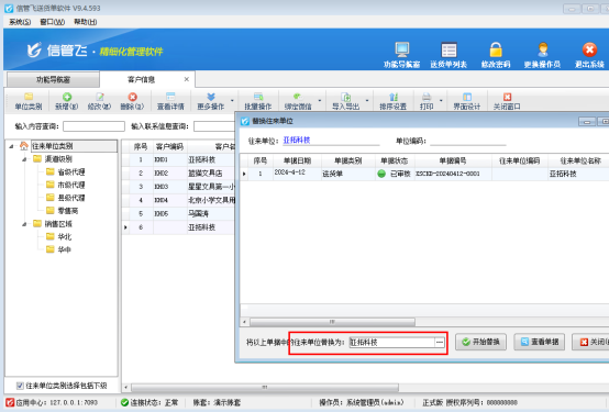 演示視頻觀看鏈接:信管飛軟件如何刪除已開單重復客戶信息? 信管飛倉庫管理軟件、信管飛送貨單軟件、信管飛RMS軟件等都支持維護客戶信息,客戶信息支持開單直接新增和基礎資料中新增,有時開單直接新增導致出現客戶信息重復的現象,在客戶信息中刪除重復客戶名稱。會彈出提示“當前選擇的往來單位在業務單據中有使用,不能刪除!”本文以“送貨單軟件”為例,示范下如何刪除? 為了刪除已開單的重復客戶信息,保留一個客戶名名稱,可在客戶信息的“更多操作”下選擇“替換相關業務單
