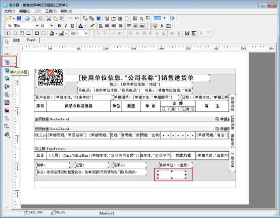 此文章相關(guān)演示視頻:打印模板如何添加業(yè)務(wù)員名字演示視頻 信管飛系列軟件都支持自定義設(shè)計(jì)打印模板,有用戶(hù)需要在模板中添加業(yè)務(wù)員打印,該如何操作呢?本文以“信管飛送貨單軟件”為例進(jìn)行示范下。 在送貨單開(kāi)單界面點(diǎn)擊“打印”—》“打印格式設(shè)計(jì)”,選擇需要修改的模板點(diǎn)擊“設(shè)計(jì)格式”,進(jìn)入模板設(shè)計(jì)器界面,模板設(shè)計(jì)器界面選擇左邊工具欄“插入文本框”,把文本框放到合適的位置,文本框?qū)挾瓤筛鶕?jù)輸入的內(nèi)容進(jìn)行調(diào)整,如下圖所示: &nbs