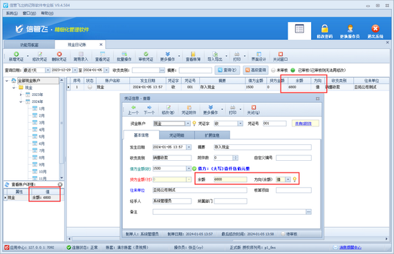 出納記賬軟件支持設置多個操作員賬號并對操作員賬號設置權限,有用戶登錄軟件無法查看出納日記賬資金賬戶余額,如下圖所示: 演示視頻觀看鏈接:操作員無法查看出納日記賬資金賬戶余額,如何解決演示視頻 出現以上問題的原因是:當前登錄的操作員賬號沒有查看出納日記賬資金賬戶余額的權限。 解決方法如下:使用系統管理員賬號登錄軟件,在功能導航窗點擊“系統管理”—》“操作員及授權”打開操作員管理及授權界面,選擇操作員賬號,在“其他操作權限”界面將“不可查看出納日記賬資金