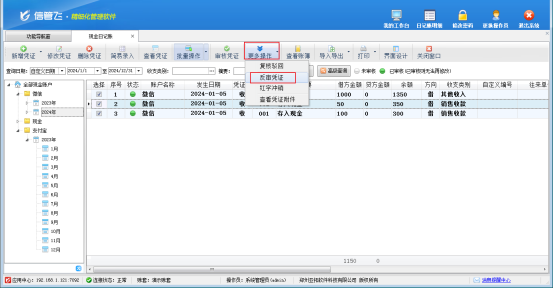 此文章相關演示視頻:如何批量反審日記賬憑證演示視頻 信管飛出納記賬軟件是一款集現金/銀行日記賬、應收應付款管理、工資管理、發票管理等為一體的綜合性財務出納管理軟件,軟件默認日記賬憑證審核后,不允許直接修改,有用戶在審核之后需要修改憑證,已審核狀態下無法進行修改,需要先反審憑證才能修改,如果需要修改的憑證過多,一個一個進行反審比較麻煩,為了提高效率,軟件內支持批量反審憑證,本文以“信管飛出納記賬軟件”為例進行示范。 在功能導航窗點擊“出納管理”—》“現