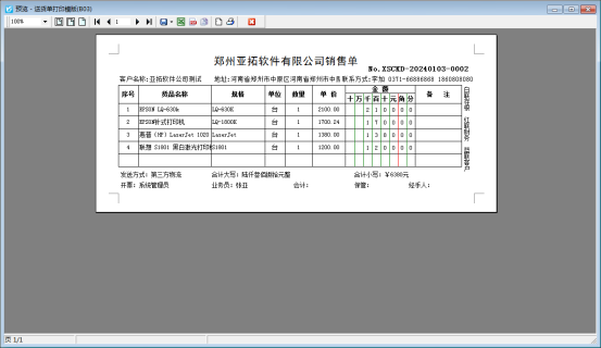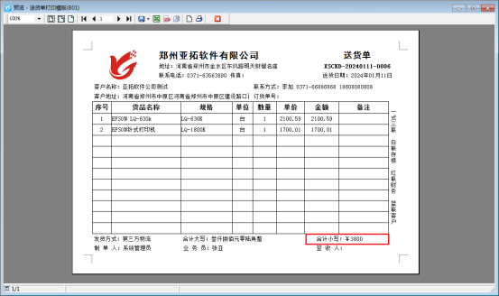 信管飛RMS軟件、信管飛送貨單軟件、信管飛倉庫管理軟件等都支持開銷售單和打印銷售單,有存在銷售合計金額有小數的情況,打印需要取整但是不進行四舍五入,該如何設置? 此文章相關演示視頻:打印模板如何設置金額取整不進行四舍五入演示視頻 本文以“信管飛送貨單軟件”為例,示范下打印模板如何設置金額取整顯示并且不進行四舍五入,新開一個送貨單,金額存在小數,打印預覽圖如下: 需要打印模板金額取整不進行四舍五入,在開單