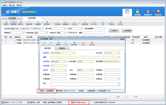 信管飛送貨單軟件支持設置多個操作員并對操作員賬號設置操作權限,有用戶登錄軟件無法修改應收款信息,系統彈出提示“當前記錄為其它操作員錄入的,您沒有權限修改!”,如下圖所示。 演示視頻觀看鏈接:操作員無法修改其他人員錄入的應收款,如何解決演示視頻 出現以上問題的原因是:當前登錄的操作員賬號沒有可修改其他人員錄入的應收款權限。 解決方法如下:使用系統管理員賬號登錄軟件,在功能導航窗點擊“系統管理”—》“操作員及授權”打開操作員管理及授權界面,選擇操作員賬號