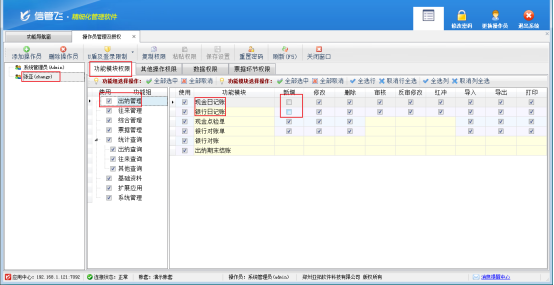 此文章相關演示視頻:如何設置操作員不能新增日記賬演示視頻 信管飛出納記賬軟件支持新增、修改現金/銀行日記賬憑證,有些客戶在使用過程中,不需要操作員進行新增,只用查看憑證即可,軟件支持設置操作員權限,本篇文章介紹下如何操作? 在功能導航窗點擊“系統管理”—》“操作員及授權”打開操作員管理及授權界面,選擇操作員“張亞”,在功能模塊權限界面,選擇“出納管理”—》“現金/銀行日記賬”,把日記賬“新增”權限勾選