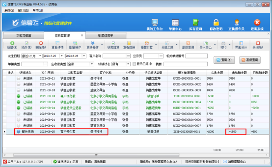 信管飛RMS軟件是集采購管理、銷售管理、倉庫管理、往來應收應付款管理為一體的軟件,軟件支持登記客戶預付款,客戶下單前可先支付定金,有用戶咨詢上月的預付款還未結銷需要退回一部分,軟件中該如何操作?本文以信管飛RMS軟件為例進行示范下。 演示視頻觀看鏈接:客戶預付款需要退回部分,如何操作? 方式一:軟件不需要體現退款記錄,可直接打開銷售訂單修改預收定金金額為1500元,如下圖所示: 方式二:對客戶預付款記錄進行結算操作。