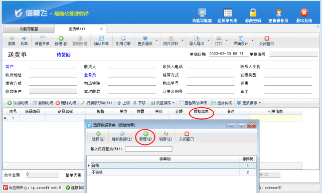 信管飛系列軟件開單界面均支持自定義設計顯示數據項。軟件除了默認顯示的數據項外,可以額外添加擴展數據項,擴展信息數據項支持設置取值方式,如果擴展字段內容是固定的,可以設置為選擇錄入,可大大提高開單效率,本文以“信管飛送貨單軟件”為例,示范下如何設置擴展信息可選擇錄入? 示例:送貨單添加擴展信息1(質檢結果),擴展信息內容固定為:合格或不合格 演示視頻觀看鏈接:如何設置擴展信息可選擇錄入? 功能導航窗選擇“
