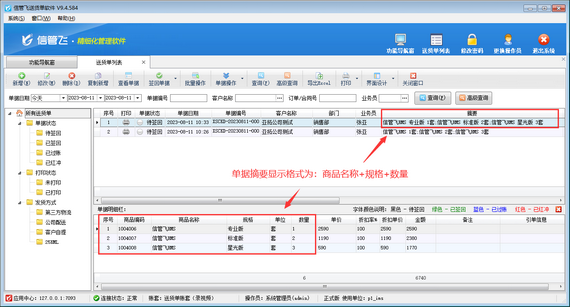 演示視頻觀看鏈接:送貨單軟件如何設(shè)置單據(jù)摘要顯示格式演示視頻 送貨單確認(rèn)開單后,系統(tǒng)可以自動生成送貨單摘要內(nèi)容,默認(rèn)摘要顯示格式為“商品名稱 數(shù)量”,如下圖所示,同時(shí)系統(tǒng)也支持修改摘要顯示格式,本篇文章介紹一下送貨單軟件如何設(shè)置摘要顯示格式? 在功能導(dǎo)航窗點(diǎn)擊“系統(tǒng)管理”—》“系統(tǒng)參數(shù)設(shè)置”—》“系統(tǒng)參數(shù)”,打開系統(tǒng)參數(shù)設(shè)置界面,修改單據(jù)摘要格式即可,如下圖所示,示例設(shè)置單據(jù)摘要顯示格式為“商品名稱 +規(guī)格+ 數(shù)量”。 單據(jù)摘要格式設(shè)置完成后,重新填