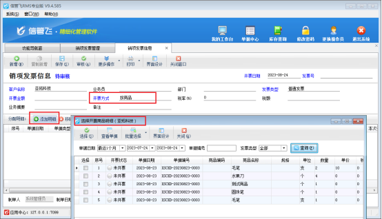 此文章相關(guān)演示視頻:按商品填開發(fā)票時(shí)提示軟件已啟用對賬單,如何解決? 企業(yè)在開采購入庫單和銷售出庫單時(shí)都存在開發(fā)票的情況,信管飛RMS發(fā)票管理功能可以讓企業(yè)高效快速地管理發(fā)票信息。 有用戶在填開發(fā)票時(shí),會出現(xiàn)按商品無法填開發(fā)票的情況,系統(tǒng)提示“軟件已啟用對賬單,‘開票方式’請選擇‘按單據(jù)’!”,如下圖所示。 出現(xiàn)此問題的原因是啟用了特殊功能參數(shù)影響,解決方法如下:在功能導(dǎo)航窗點(diǎn)擊“系統(tǒng)管理”—》“系統(tǒng)參