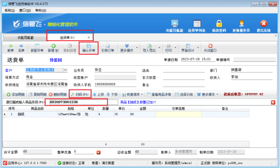 此文章相關演示視頻:掃碼添加明細,如何設置自動累加商品數量演示視頻 信管飛軟件支持掃碼添加商品明細,商品銷售時可以直接通過掃碼的方式添加商品明細錄入銷售單據。有部分客戶在掃碼添加同種商品條碼時開單界面商品數量不會自動累加,本文示范下開單界面掃碼添加明細,如何設置自動累加商品數量? 在功能導航欄,基礎資料--商品信息,需要把商品條形碼提前在商品信息界面錄入維護全面。商品信息界面如圖所示: 在功能導航欄,系統
