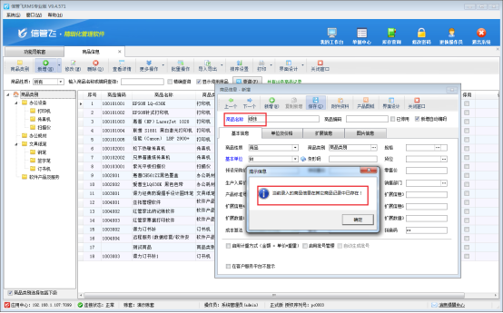 此文章相關演示視頻:新增商品時提示當前錄入的商品信息已存在,如何解決演示視頻 部分用戶在商品信息中新增商品時,會出現無法新增,提示“當前錄入的商品信息在其他商品記錄中已存在”的情況,查詢商品信息,會發現商品信息中并沒有此商品,本篇文章介紹下遇到此種問題該如何解決? 商品信息中新增一個新商品,出現以下提示: 出現此種原因是由于勾選參數“