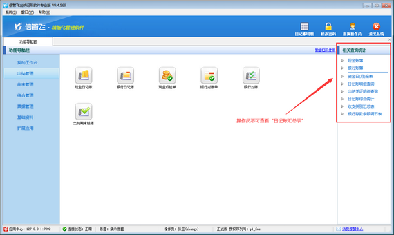 演示視頻觀看鏈接:出納記賬軟件如何設置操作員不可查看日記賬匯總表演示視頻 信管飛出納記賬軟件內包含豐富的記賬統計報表,如現金賬簿、銀行賬簿、日記賬匯總表、收支類別匯總表等。如果不希望員工賬號登錄后查看到這些報表,如何設置呢?本篇文章演示一下出納記賬軟件內如何設置操作員不可查看日記賬匯總表? 登錄軟件,在功能導航窗點擊“系統管理”—》“操作員及授權”,進入“操作員管理及授權”界面,選擇操作員“張亞”,在其右側的功能模塊權限內選擇“出納查詢”模塊,將日記賬匯總表的“使用”權限勾選取消,然