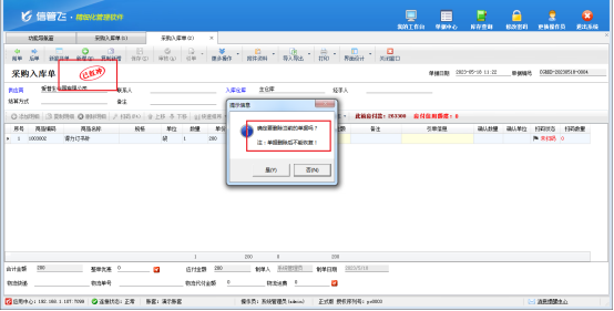 此文章相關演示視頻:已紅沖單據刪除不了如何解決演示視頻 信管飛RMS軟件、信管飛倉庫管理軟件、信管飛送貨單軟件都支持紅沖單據,部分客戶在刪除已紅沖的單據時,會發現已紅沖的單據刪除不了,如何刪除已紅沖的單據呢?本文以“信管飛RMS軟件”為例介紹下如何操作? 打開一張已紅沖單據,更多操作下點刪除單據會發現無法進行刪除,如圖: 解決方法如下:功能導航窗點擊系統管理—》“系統參數配置”—》“業務參數”,“業務單