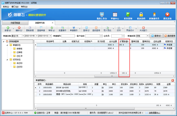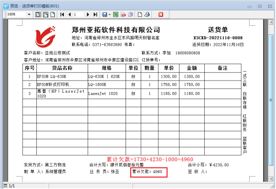 此文章相關(guān)演示視頻: 打印模板如何顯示客戶累計欠款演示視頻 信管飛送貨單軟件、信管飛RMS軟件等可開銷售單和打印銷售單,軟件中默認(rèn)有十幾種打印模板格式,有用戶需要在打印模板上體現(xiàn)客戶的欠款信息,內(nèi)置模板中沒有此數(shù)據(jù)項,本文以內(nèi)置模板進(jìn)行示范如何添加客戶欠款數(shù)據(jù)項。 新開一個銷售單并保存,選擇客戶“亞拓軟件測試”開單,界面上顯示應(yīng)收款為1730(本單前應(yīng)收款),本單應(yīng)收金額4230,本次收款金額1000,打印模板上需要顯示客戶欠款,在開單界面