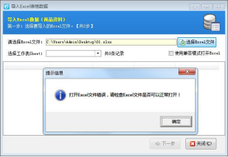 信管飛RMS、信管飛送貨單軟件、信管飛出納記賬系統(tǒng)都支持通過Excel導(dǎo)入數(shù)據(jù),通過Excel數(shù)據(jù)導(dǎo)入可以將數(shù)據(jù)方便快捷的導(dǎo)入到軟件中,省去了使用初期大量的數(shù)據(jù)的錄入所要消耗的時間及人力物力,并避免人為錄入造成的誤差,使數(shù)據(jù)的錄入簡單、準(zhǔn)確、高效。導(dǎo)入Excel數(shù)據(jù)時,如果是Excel2007以上版本的格式文件(.xlsx),系統(tǒng)提示:打開Excel文件錯誤,請檢查Excel文件是否可以打開。如下圖所示: 出現(xiàn)這種問題的原因是excel文件不兼容,處理方式有兩種:第一,將Excel文件用Excel