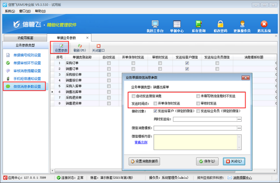 微信消息服務(wù)是信管飛軟件基于微信開放平臺(tái)研發(fā)的業(yè)務(wù)消息發(fā)送服務(wù),支持即時(shí)推送業(yè)務(wù)單據(jù)消息,如訂單通知、發(fā)貨信息等。支持客戶查看消息詳情(可配置外部查看數(shù)據(jù)項(xiàng))、單據(jù)簽收確認(rèn)、分享轉(zhuǎn)發(fā)等功能。 推送微信消息接收人員支持推送給業(yè)務(wù)員、客戶,系統(tǒng)內(nèi)支持邀請(qǐng)業(yè)務(wù)員及客戶綁定微信賬號(hào),業(yè)務(wù)員及客戶綁定微信賬號(hào)后,在軟件內(nèi)開單時(shí)即可對(duì)業(yè)務(wù)員及客戶綁定微信賬號(hào)推送業(yè)務(wù)單據(jù)消息。本篇文章介紹一下如何設(shè)置自動(dòng)發(fā)送微信消息? 在功能導(dǎo)航窗點(diǎn)擊“系統(tǒng)管理”—》“單據(jù)業(yè)務(wù)參數(shù)”,在單據(jù)業(yè)務(wù)參數(shù)界面選擇微信消息
