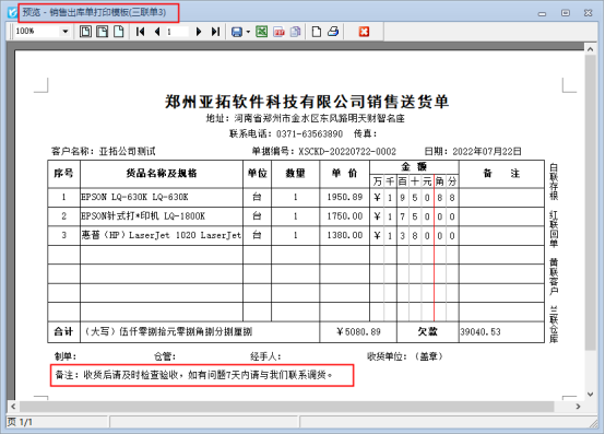 信管飛系列軟件都支持自定義設(shè)計(jì)打印模板,打印模板如果前期設(shè)計(jì)的時(shí)候沒(méi)有添加備注內(nèi)容(例如:注意事項(xiàng)),后期需要再添加該如何操作?本文以“信管飛送貨單軟件”為例進(jìn)行示范下。 新開(kāi)送貨單確認(rèn)保存,默認(rèn)打印模板預(yù)覽界面如下圖: 需要添加備注內(nèi)容,在送貨單開(kāi)單界面點(diǎn)擊“打印”下的“打印格式設(shè)計(jì)”,選擇模板點(diǎn)擊“設(shè)計(jì)格式”,進(jìn)入模板設(shè)計(jì)器界面,模板設(shè)計(jì)界面選擇左邊工具欄“插入文本框”,然后放置到頁(yè)尾處,文本框?qū)挾瓤筛鶕?jù)輸入的內(nèi)容進(jìn)行調(diào)整,如下圖所示: