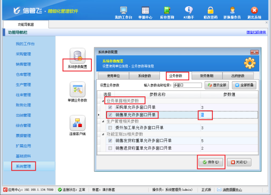 信管飛進銷存軟件中可以設置同一商品不同的客戶型號,方便用戶管理同一個商品多型號的情況,本篇文章以信管飛RMS軟件來詳細介紹一下如何啟用同一商品不同的客戶型號功能? 觀看演示視頻,快速設置同一商品不同客戶型號的設置方法。鏈接已備,點擊即學。 在功能導航窗點擊“系統(tǒng)管理”——》“系統(tǒng)參數(shù)設置”——》“業(yè)務參數(shù)”可以進入到“業(yè)務參數(shù)”配置界面,在用戶定制功能參數(shù)內(nèi)打勾啟用“啟用商品的客戶型號管理”參數(shù),并設置商品信息中不同客戶的客戶型號,如下圖所