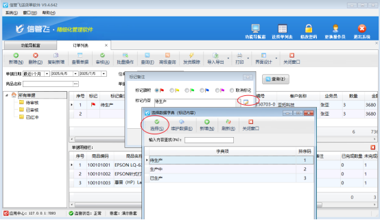 信管飛軟件支持對訂單列表、送貨單列表以及退貨單列表使用不同顏色旗幟標記備注,把標記常用內(nèi)容可提前維護到數(shù)據(jù)字典中,方便標記時候直接選擇錄入,例如訂單列表,可以先把生產(chǎn)狀態(tài)維護在數(shù)據(jù)字典中,標記直接使用。本文示范下如何操作? 訂單列表界面,雙擊標記備注項,點擊維護標記備注內(nèi)容,進入選擇數(shù)據(jù)字典(標記內(nèi)容)界面,點擊維護數(shù)據(jù)可進入標記內(nèi)容維護。 在標記內(nèi)容維護界面點擊新增,可以增加固定選項的標記內(nèi)容名稱。 &