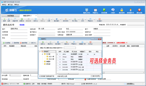 有用戶操作員賬號登錄軟件在新增單據(jù)時,無法選擇業(yè)務員,如下圖所示,選擇業(yè)務員窗口看不到員工信息。 演示視頻觀看鏈接:選擇業(yè)務員窗口看不到員工信息,如何解決演示視頻 出現(xiàn)以上問題的原因是:當前登錄的操作員賬號沒有查看部門員工的權限。 解決方法如下:使用系統(tǒng)管理員賬號登錄軟件,在功能導航窗點擊“系統(tǒng)管理”—》“操作員及授權”打開操作員管理及授權界面,選擇操作員賬號,在“數(shù)據(jù)權限”界面將部門員工“查看所有數(shù)據(jù)”的權限勾選上,然后保存權限設置,如下圖所示。&