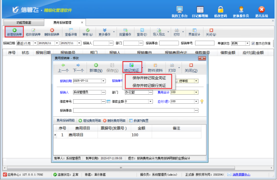 在企業(yè)財務流程里,員工先行墊付費用、事后報銷是常見操作。而出納將費用報銷單準確轉(zhuǎn)記到流水賬、生成出納憑證,傳統(tǒng)方式既繁瑣又易出錯。信管飛出納記賬軟件憑借便捷操作,讓這一過程輕松又高效。 操作便捷,流程清晰 快速錄入報銷單:在軟件功能導航窗點擊“綜合管理”—》“費用報銷管理”,進入報銷管理界面。新增錄入報銷單,信息填寫直觀簡單,完成后點擊保存,輕松完成報銷單創(chuàng)建。 靈活轉(zhuǎn)記憑證:在新增報銷單界面,點擊“轉(zhuǎn)記憑證”,報銷單可靈活選