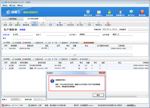 生產任務單,即生產過程中的任務加工單,用于執行生產計劃,進入實際生產階段。生產領料出庫單,即生產過程中可通過開“生產領料出庫單”領取原材料出庫。軟件內生產領料出庫單支持引用生產任務單進行領料出庫,本篇文章介紹一下進銷存軟件如何設置生產領料單數量不可大于生產任務單數量? 在功能導航窗點擊“系統管理”—》“系統參數配置”—》“業務參數”打開業務參數配置界面,在生產管理相關參數中打鉤啟用“生產領料單數量不可大于生產任務單數量”參數,如下圖所示。 參數配置完成之后,新增生產領料出庫單,引用生產