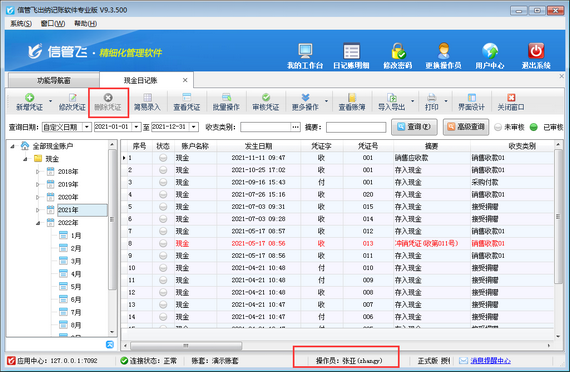 出納記賬軟件支持登記現金(銀行)日記賬,已保存的日記賬如有填寫錯誤,支持刪除,已審核的出納日記賬需反審后可進行刪除操作,本篇文章介紹一下如何設置操作員賬號不可刪除出納日記賬。 登錄軟件,在功能導航窗點擊“系統管理”—》“操作員及授權”,進入“操作員管理及授權”界面,選擇操作員“張亞”,在其右側的功能模塊權限內選擇“出納管理”模塊,將現金日記賬和銀行日記賬的“刪除”權限取消勾選,然后保存設置,如下圖所示。 操作員權限設置完成后,關閉當前窗口,更換操作員“張亞”登錄軟件,點擊“出納管理”—