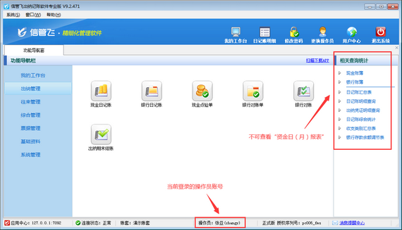 信管飛出納記賬軟件內包含豐富的記賬統計報表,如現金賬簿、銀行賬簿、資金日(月)報表、收支類別匯總表等。如果不希望員工賬號登錄后查看到這些報表,如何設置呢?本篇文章以信管飛出納記賬軟件專業版為例演示一下出納記賬軟件內如何設置操作員不可查看資金日(月)報表? 登錄軟件,在功能導航窗點擊“系統管理”—》“操作員及授權”,進入“操作員管理及授權”界面,選擇操作員“張亞”,在其右側的功能模塊權限內選擇“出納查詢”模塊,將資金日(月)報表的“使用”權限勾選取消,然后保存設置,如下圖所示。 操作員權