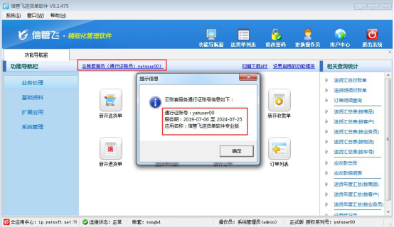 信管飛送貨單軟件、信管飛RMS軟件、信管飛倉庫管理軟件、信管飛出納記賬軟件等都支持云帳套服務,云賬套服務是信管飛軟件推出的數據存在云端,通過通行證賬號和密碼連接云端數據,此服務不限時間和地點,有網絡就可以使用。云賬套服務按年收費,為避免不清楚什么時間到期續費影響軟件使用,軟件增加可在登錄界面查看服務期的功能。 使用云賬號登錄軟件后,在軟件功能導航欄對應顯示出云賬套服務(通行證賬號),點擊此處會彈出窗口,顯示通行證賬號和服務期,如下圖所示: 注意:云賬