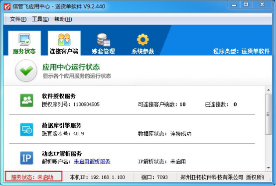 信管飛系列軟件,采用先進的多層技術體系架構,程序運行安全、穩定、高效。客戶端程序與服務器端程序(即“信管飛軟件應用中心”程序)進行通訊,需要設置通訊端口,有用戶打開應用中心程序的時候提示服務狀態未啟動(如下圖),軟件無法登錄,這種是端口被占用導致,解決方法如下 打開應用中心程序,點擊“系統參數”,在基本參數中修改下端口號,比如送貨單默認端口號是7093,如果占用沖突,可修改為7094、7095...,修改后點擊保存,然后退出重啟應用中心程序,如下圖所示: