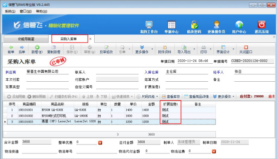 信管飛RMS軟件、信管飛倉庫管理軟件、信管飛送貨單軟件等支持在采購單、銷售單匯總表(送貨單匯總對賬單)、采購單、銷售單明細查詢(送貨明細對賬單)、采購訂單、銷售訂單明細表(訂單明細查詢)中設置擴展信息為查詢條件,可匯總單據明細或者單據主體項中擴展信息內容。 以“采購單明細查詢”為例,示范下如何在界面設計中配置。功能導航窗選擇“采購管理”在右側的查詢統計下打開“采購單明細查詢”進入采購單明細查詢界面,點擊“界面設計”按鈕,在打開的界面設計窗口中找到“擴展信息1”數據項,勾選顯示并在可查詢處設置“可作