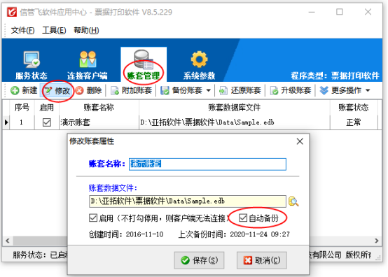 信管飛票據打印軟件、信管飛送貨單軟件、信管飛RMS、信管飛出納記賬軟件、信管飛倉庫管理軟件都支持設置賬套自動備份,我們強烈建議啟用自動備份功能,以便賬套出現問題的時候從賬套備份文件中恢復數據。下面我們以信管飛票據打印軟件為例詳細介紹一下如何啟用賬套自動備份功能? 首先打開軟件應用中心主界面,點擊“系統參數”—》“賬套備份參數”,可以打開賬套備份參數界面,賬套備份參數內可設置是否啟用自動備份、備份時間間隔和備份目錄。 勾選“啟用賬套自動備份”即可啟用系統賬套自動備份功能,軟件支持每天備份