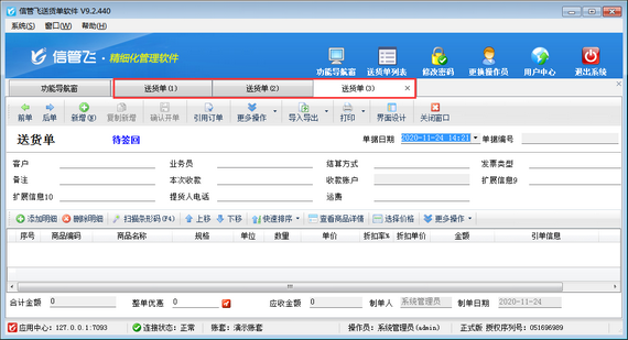 信管飛送貨單軟件支持多窗口同時開單,軟件默認同時只能填開一張送貨單,如果單據比較多,需要同時填開多張送貨單的情況下,可以根據本文介紹進行參數配置,示例如下: 在功能導航窗點擊“系統管理”—》“系統參數配置”—》“業務參數”打開業務參數配置界面,然后在業務單據相關參數內,勾選啟用“銷售單允許多窗口開單”參數,并設置下參數值(同時支持窗口數),然后點擊“保存”按鈕保存配置即可,如下圖所示。 設置完之后,在功能導航窗點擊“業務處理”—》“新開送貨單”,打開新開送貨單界面后,可以再到功能導航窗