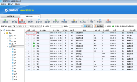 信管飛RMS標準版和專業版都包括登記出納日記賬憑證功能,在新增保存日記賬憑證后都可以直接審核憑證,憑證審核后,不允許直接刪除。客戶如果需要刪除已審核的憑證,需要先反審憑證,再進行刪除。下面我們介紹一下在信管飛RMS專業版中如何刪除已審核的日記賬憑證? 在功能導航窗點“出納管理”—》“現金日記賬”即可進入“現金日記賬”界面,對“已審核”的憑證進行刪除時,系統會提示“當前憑證已審核,無法執行刪除操作!”,如圖1所示。圖1 在現金日記賬列表界面,如圖2所示,點擊“更多操作”—》“反審憑證”,