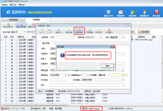 信管飛票據(jù)打印軟件開單后,自動保存數(shù)據(jù),方便以后查閱或打印,填開支票、承兌匯票、快遞單以及其他票據(jù)時,軟件支持添加文檔、圖表等附件資料,可掃描或導入與票據(jù)相關的電子文件,方便用戶更全面、直接地查詢票據(jù)的全過程,有利于企業(yè)票據(jù)管理控制(如下圖所示)。為避免每個操作員都可以查看到票據(jù)的附件資料,軟件支持控制操作員的可查看附件資料權限。本文介紹一下如何設置操作員不可查看附件資料? 在功能導航窗點擊“系統(tǒng)管理”—》“操作員及授權”打開操作員管理及授權界面,選擇操作員“張亞”,在“其他操作權限”中把權限“可查看附件資料”勾選取消,