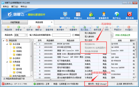 信管飛送貨單軟件、信管飛RMS、信管飛倉庫管理軟件等都支持管理基礎資料信息和允許設置多個操作員進行登錄軟件。軟件支持將基礎資料信息以EXCEL的形式導出放到自定義的文件夾內(nèi)以便用戶備份或保存數(shù)據(jù),如果需要設置操作員不允許導出商品信息,如何設置?本文以倉庫管理軟件為例,示范下如何設置操作員不可導出商品信息。 在功能導航窗點擊“系統(tǒng)管理”—》“操作員及授權”打開操作員管理及授權界面,選擇操作員“張亞”,在功能模塊權限界面,選擇“基礎資料”—》“商品信息”,在導出權限下,把商品信息“導出”權限勾選取消后保存權限設置,如下圖所示