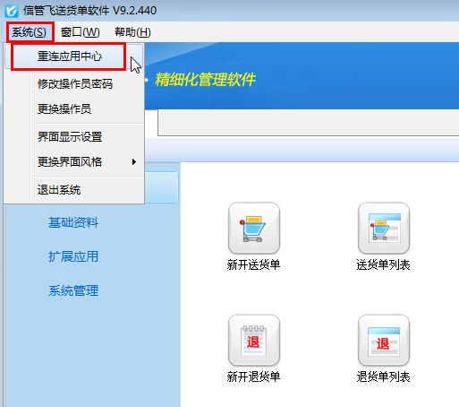 信管飛RMS、信管飛倉庫管理軟件、信管飛票據(jù)打印軟件、信管飛出納記賬軟件、信管飛送貨單軟件都包括客戶端程序和應用中心程序兩個模塊,客戶端程序登錄系統(tǒng)時,應用中心程序是必須打開的。如果主機電腦關機或關閉應用中心程序、程序出現(xiàn)異常等,客戶端程序與應用中心的連接就會斷開。應用中心程序再次正常運行后,客戶端程序需要重新建立與應用中心程序的連接。下面我們以信管飛送貨單軟件為例介紹一下客戶端程序重連應用中心程序的操作方法。 客戶端程序與應用中心程序斷開時,軟件界面最下方的“連接狀態(tài)”會顯示“已斷開”,如圖1所示。圖 1 &