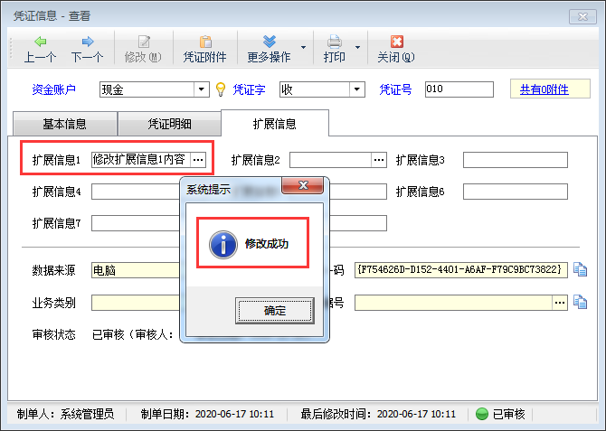 出納記賬軟件中默認(rèn)不允許直接修改已審核憑證的擴(kuò)展信息,但是如需修改已審核憑證的擴(kuò)展信息,系統(tǒng)支持參數(shù)配置,如下圖所示,啟用參數(shù):“可修改已審核憑證的擴(kuò)展信息”,參數(shù)值可自定義,默認(rèn)為“ext1,ext2(擴(kuò)展信息1,擴(kuò)展信息2)”,參數(shù)啟用后即可修改已審核憑證的擴(kuò)展信息,但是如需普通操作員可修改已審核憑證的擴(kuò)展信息,需要另外設(shè)置一下操作員權(quán)限,本文介紹一下如何設(shè)置操作員可修改已審核憑證擴(kuò)展信息的操作權(quán)限? 在功能導(dǎo)航窗點“系統(tǒng)管理”→“操作員及授權(quán)”即可進(jìn)入“操作員管理及授權(quán)”界面,選中操作員賬號,在“其他操作權(quán)限”界面