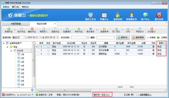 信管飛RMS標(biāo)準(zhǔn)版和專業(yè)版、信管飛出納記賬軟件都支持操作員不可查看其他人員憑證的權(quán)限,本文以“信管飛RMS專業(yè)版為例”示范下如何設(shè)置操作員不可查看其他人員錄入的憑證? 在功能導(dǎo)航窗點“系統(tǒng)管理”—》“操作員及授權(quán)”即可進(jìn)入“操作員管理及授權(quán)”界面,選中操作員賬號,在“其他操作權(quán)限”界面將“不可查看其他人員錄入的出納憑證”權(quán)限勾選上,如下圖所示,設(shè)置操作員賬號“張亞”不可查看其他人員錄入的出納憑證。 設(shè)置權(quán)限完成后,使用操作員“張亞”登錄軟件并打開現(xiàn)金