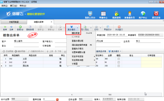 信管飛RMS(進(jìn)銷存管理軟件)、信管飛倉庫管理軟件中業(yè)務(wù)單據(jù)已審核后默認(rèn)是不允許刪除的,如下圖所示,刪除按鈕為灰色的,不可操作,那么如果單據(jù)審核后發(fā)現(xiàn)此單做錯了,需要刪除,如何操作呢?本篇文章詳細(xì)介紹一下倉庫管理軟件內(nèi)如何刪除已審核的業(yè)務(wù)單據(jù)? 業(yè)務(wù)單據(jù)已審核后默認(rèn)是不允許刪除的,如果需要刪除,需要先紅沖此單據(jù),然后再刪除,即可刪除成功,在單據(jù)界面工具欄點擊“更多操作”—》“紅沖單據(jù)”即可紅沖單據(jù),如下圖所示: 單據(jù)紅沖后即可進(jìn)行刪除操作,如下圖所示: