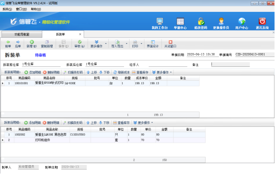 拆裝單用于處理進(jìn)貨時(shí)為組件、配件、原料等,但銷售時(shí)卻是成套銷售的,比如電腦經(jīng)銷商,采購的是電腦配件,但實(shí)際銷售的是整機(jī)。也有購入的是整機(jī),但銷售的時(shí)候是按單個(gè)配件進(jìn)行銷售的情況,也可以使用拆裝單進(jìn)行處理。 信管飛RMS專業(yè)版、信管飛倉庫管理軟件中包含拆裝單功能的使用,下面我們以信管飛倉庫管理軟件為例來演示一下具體的操作步驟。 在功能導(dǎo)航窗點(diǎn)“倉庫管理”—》“拆裝單”即可進(jìn)入“拆裝單”界面,如下圖所示:圖1 圖2 單據(jù)上方為“拆裝前商品明細(xì)”