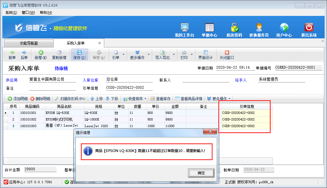 在采購貨品時(shí)有時(shí)需要先由庫存人員根據(jù)實(shí)際庫存預(yù)警情況開采購訂單,然后采購人員根據(jù)采購訂單進(jìn)行采購入庫。為避免采購數(shù)量大于訂單數(shù)量進(jìn)行入庫的情況,軟件支持控制采購數(shù)量不可超過訂單數(shù)量,本文以“信管飛倉庫管理軟件”為例,示范下如何設(shè)置“采購數(shù)量不可超過訂單數(shù)量”。 在功能導(dǎo)航窗點(diǎn)擊“系統(tǒng)管理”—》“系統(tǒng)參數(shù)配置”—》“業(yè)務(wù)參數(shù)”,即可進(jìn)入到“業(yè)務(wù)參數(shù)”界面,在業(yè)務(wù)單據(jù)明細(xì)參數(shù)中勾選“采購數(shù)量不可超過訂單數(shù)量”參數(shù),然后點(diǎn)擊“保存”按鈕保存配置,如下圖所示。 設(shè)置完之后,在功能導(dǎo)航窗點(diǎn)擊“采