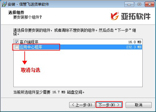 亞拓軟件旗下的信管飛送貨單軟件、信管飛RMS軟件、信管飛出納記賬軟件等都支持網(wǎng)絡(luò)版本使用。網(wǎng)絡(luò)版本指多臺電腦多人同時(shí)共享數(shù)據(jù)使用。一臺作為主機(jī)電腦,另外為客戶端電腦連接主機(jī)電腦數(shù)據(jù)進(jìn)行共享使用(默認(rèn)局域網(wǎng))。 主機(jī)電腦需要安裝應(yīng)用中心程序和客戶端程序,客戶端電腦只需要安裝客戶端程序即可。以“送貨單軟件為例”示范下如何安裝客戶端電腦程序,在客戶端電腦下載好安裝程序后,直接打開安裝,點(diǎn)擊“下一步”到“選擇組件”時(shí),把應(yīng)用中心程序取消勾選,只安裝客戶端程序,如下圖所示: &nbs