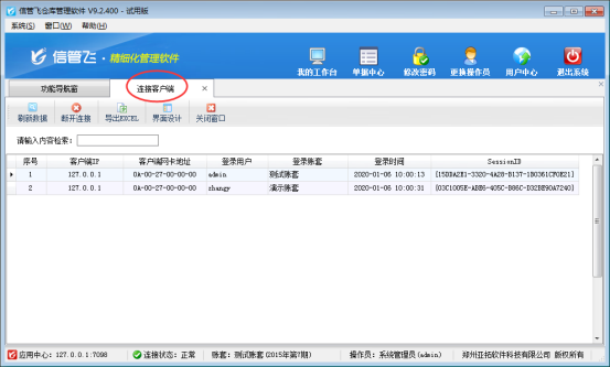 亞拓軟件自主研發的信管飛RMS(進銷存軟件)、信管飛倉庫管理軟件、信管飛送貨單軟件、信管飛出納記賬軟件等軟件都支持多用戶同時登錄使用軟件,數據同步共享。 本文以信管飛倉庫管理軟件為例,介紹一下如何查看已登錄軟件的連接客戶端。 第一種方法:在信管飛倉庫管理軟件應用中心程序中查看已登錄軟件的連接客戶端。 應用中心程序運行后,在桌面右下角顯示應用中心(紅色)圖標,雙擊即可打開應用中心主界面,如下圖所示,點擊“連接客戶端”,可以管理已連接到主機的客戶端電腦信