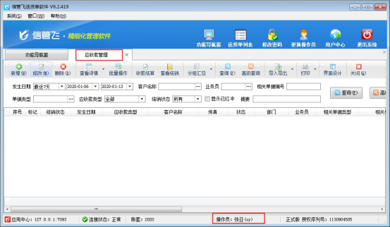 信管飛送貨單軟件是集送貨單開單打印和應收款管理為一體的軟件,軟件支持設置多操作員登錄以及可設置操作員的權限。有時需要操作員僅能開單,不可查看應收款記錄該如何設置?本文以“信管飛送貨單軟件”為例,示范如何設置操作員不可查看應收款? 用“系統管理員”登錄軟件,在功能導航窗點擊“業務處理”—》“應收款管理”,可查看所有的應收款記錄,如下圖所示: 在功能導航窗點擊“系統管理”—》“操作員及授權”進入操作員管理及授權界面,選擇操作員“張亞”,然后在右側權限設置