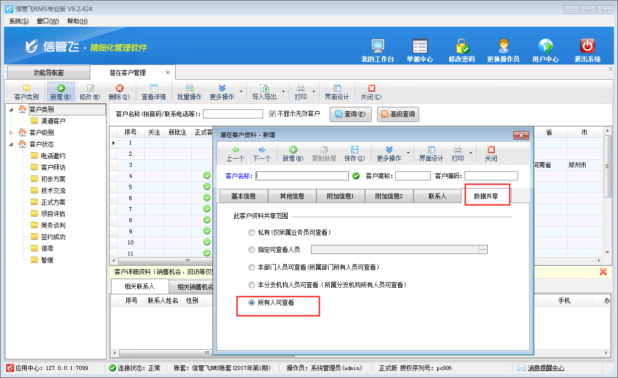 潛在客戶管理用于管理對產品(或服務)存在需求且具備購買能力的待開發客戶,這類客戶與企業存在著銷售合作機會。經過企業及銷售人員的努力,可以把潛在客戶轉變為正式客戶。潛在客戶信息可根據共享范圍進行設置,實現客戶資料的分級管理。本篇文章介紹一下如何設置新增潛在客戶的默認共享范圍? 在功能導航窗中點擊“系統管理”—》“系統參數配置”,即可進入“系統參數設置”界面,其界面如下圖所示。此處我們把新增潛在客戶默認共享范圍設置為“所有人可查看”,然后點擊“保存”按鈕保存設置。 參數設置好之后,打開“客