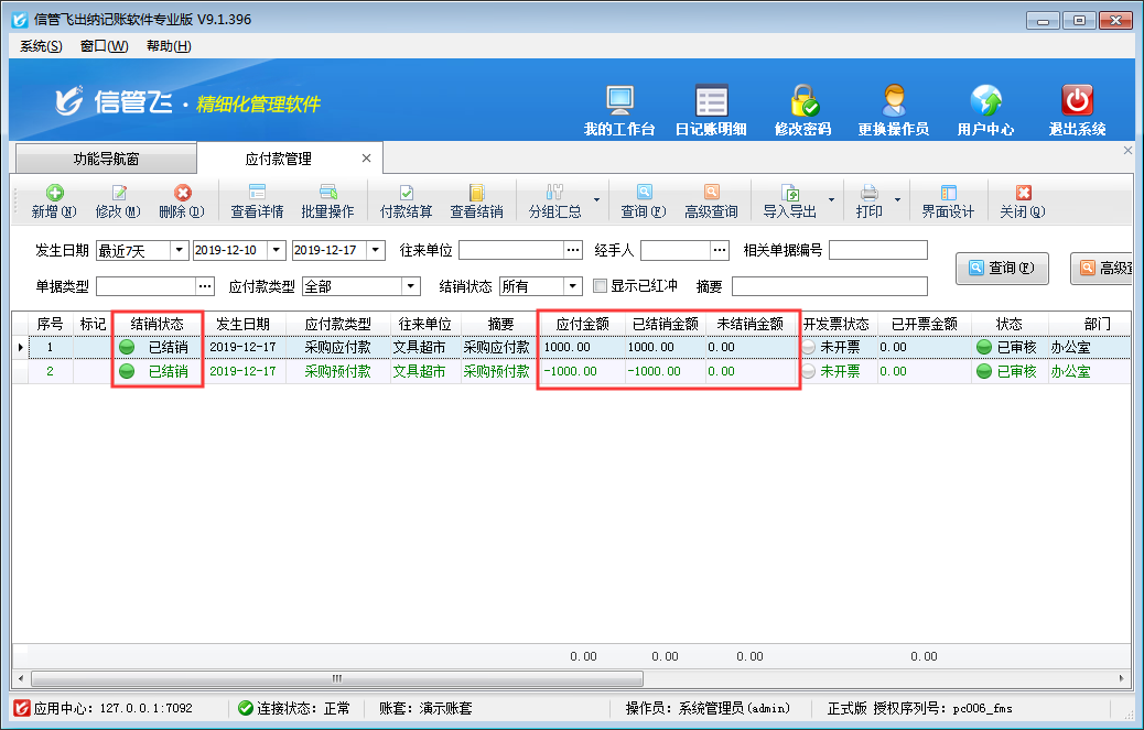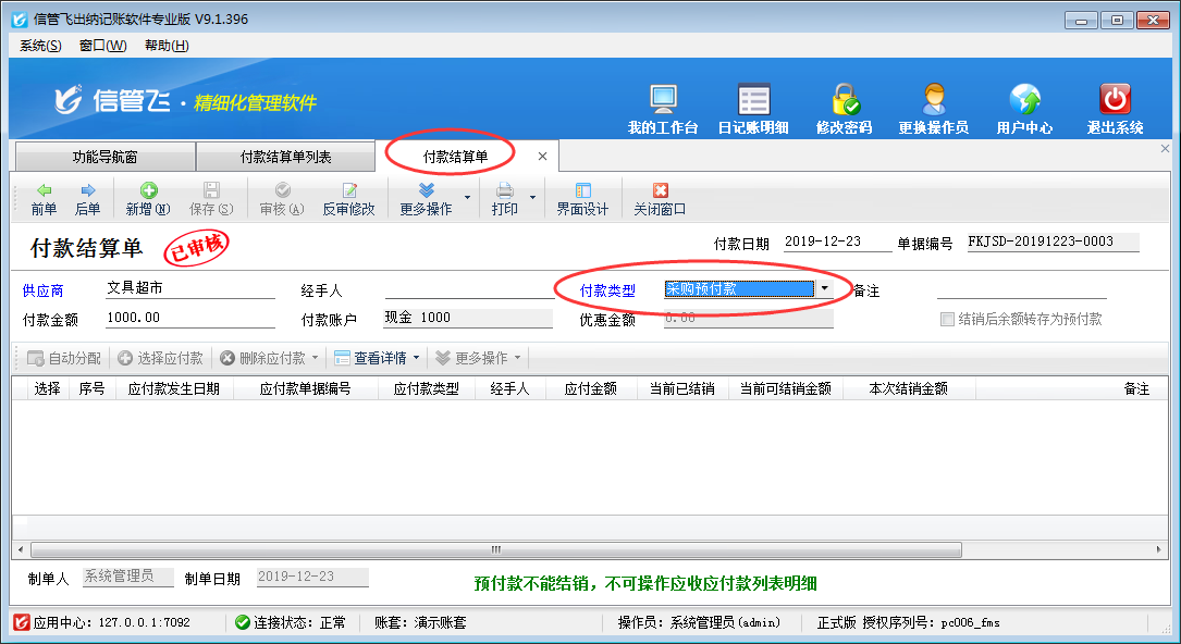 采購預(yù)付款是我們提前預(yù)付給供應(yīng)商的金額,可以用來沖銷采購產(chǎn)生的應(yīng)付款,本文以信管飛出納記賬軟件專業(yè)版為例演示一下如何使用采購預(yù)付款沖銷采購應(yīng)付款? 在功能導(dǎo)航窗點(diǎn)擊“往來管理”—》“應(yīng)付款管理”打開應(yīng)付款管理界面,如下圖所示,在應(yīng)付款管理內(nèi)對同一個供應(yīng)商分別新增一條應(yīng)付款記錄,一條預(yù)付款記錄,結(jié)銷狀態(tài)為“未結(jié)銷”狀態(tài),已結(jié)銷金額為0。 在應(yīng)付款管理界面工具欄有“付款結(jié)算”按鈕,可以打開付款結(jié)算單對采購應(yīng)付款/預(yù)付款進(jìn)行付款結(jié)銷。如下圖所示,供應(yīng)商“文具超市”應(yīng)付金額1000元,采購預(yù)付
