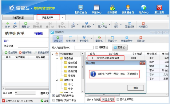 信管飛倉庫管理軟件是集采購管理、銷售管理、庫存管理為一體的進(jìn)銷存管理軟件。經(jīng)常會有用戶問到刪除客戶資料時會彈出提示信息:“當(dāng)前選擇的往來單位在單據(jù)中有使用,不能刪除”(如下圖所示),刪除不了,為什么? 系統(tǒng)默認(rèn)在單據(jù)中已使用過的往來單位信息是不能刪除的,因?yàn)槿绻麆h除,則會影響之前已使用此往來單位信息所開的業(yè)務(wù)單據(jù),對于此種情況,我們可以將需要刪除的往來單位設(shè)置為無效,本篇文章我們來介紹信管飛倉庫管理軟件內(nèi)如何將客戶信息設(shè)置為無效? &nb