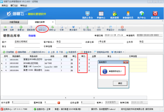 信管飛RMS、信管飛倉庫管理軟件、信管飛送貨單軟件等在業(yè)務單據(jù)保存時如果商品單價為0,系統(tǒng)會彈出提示信息,是否需要繼續(xù)保存,如下圖1所示,這樣以免用戶在添加商品明細時忘了填寫單價,好及時錄入,但是有一部分用戶在開單據(jù)時只需要填寫商品數(shù)量,不需要填寫單價,該怎么設置系統(tǒng)才能不彈出以下提示信息呢?本篇文章以信管飛倉庫管理軟件為例介紹一下如何設置出庫單保存時商品單價為0系統(tǒng)不彈出提示信息?圖1 銷售出庫單界面 在功能導航窗點擊“系統(tǒng)管理”—》“系統(tǒng)參數(shù)配置”—》“業(yè)務參數(shù)”,即可進入到“業(yè)務參數(shù)”配置界面,在業(yè)務單據(jù)保存參數(shù)內(nèi)