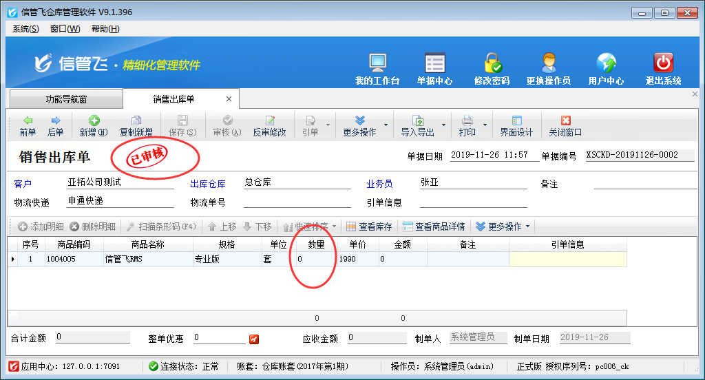信管飛RMS(進銷存管理軟件)、信管飛送貨單軟件、信管飛倉庫管理軟件內(nèi)都可以設置開單時業(yè)務單據(jù)明細數(shù)量允許為0,本篇文章以信管飛倉庫管理軟件為例詳細介紹一下在軟件內(nèi)如何設置業(yè)務單據(jù)明細數(shù)量允許為0? 在功能導航窗點擊“系統(tǒng)管理”——》“系統(tǒng)參數(shù)配置”——》“業(yè)務參數(shù)”可以進入到“業(yè)務參數(shù)”配置界面,在業(yè)務單據(jù)明細參數(shù)內(nèi)打勾啟用“業(yè)務單據(jù)明細數(shù)量允許為0”參數(shù),如下圖所示。 設置完成之后,在功能導航窗點擊“銷售管理”——》“銷售出庫單”,新增銷售出庫單,添加商品“信管飛RMS”,數(shù)量錄入
