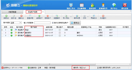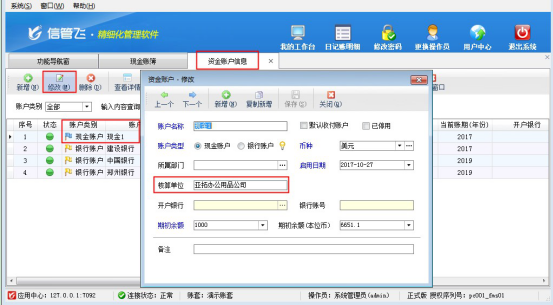出納記賬軟件下載安裝完成后,使用演示賬套中的資金賬戶登記現(xiàn)金日記賬,在現(xiàn)金日記賬界面,點擊“查看賬簿”,可進入現(xiàn)金賬簿界面,如下圖1所示,可看到核算單位顯示:亞拓辦公用品公司,如果需要修改為自己公司信息,該如何修改?本文以“信管飛出納記賬軟件”為例,示范如何修改現(xiàn)金賬簿中的核算單位。 圖1 現(xiàn)金賬簿中的核算單位默認是調(diào)用資金賬戶提前維護好的核算單位信息,因此需要修改此內(nèi)容,需要到資金賬戶中找到當前現(xiàn)金賬戶進行修改,在功能導航窗選擇“基礎資料”—》“資金賬戶”,找到現(xiàn)金賬戶“現(xiàn)金1”,點擊
