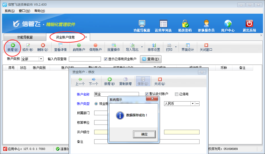 收款結(jié)算單用來登記收款信息(收款對象即客戶、收款賬戶、收款金額、經(jīng)手人等),并結(jié)銷應收款記錄。部分用戶在剛開始使用送貨單軟件對軟件功能不熟悉,首次對應收款進行收款結(jié)算,錄入收款金額時會提示:默認收付款資金賬戶不存在,請先設定默認收付款資金賬戶!(如下圖所示)無法繼續(xù)填開收款結(jié)算單。 這種情況是因為在系統(tǒng)內(nèi)沒有維護收款賬戶導致的,請在功能導航窗點擊“基礎資料”—》“資金賬戶”打開資金賬戶管理界面增加資金賬戶即可,如下圖所示。 資金賬戶新增之后,重新對應收款進行收款結(jié)算即可,如何填開收款結(jié)